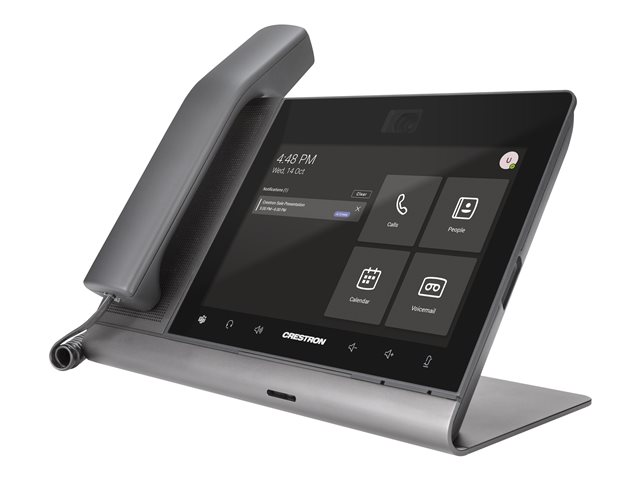 The Crestron Flex UC-P8-T-C-HS-I desk phone provides a premium video collaboration solution for use with the Microsoft Teams intelligent communications platform. It offers Full HD quality video and audio calling, capability to view and zoom the shared content, and full-duplex hands-free speakerphone capability in an elegant desktop design. It features a large 8 in. color touch screen display, built-in Full HD camera with privacy shutter, and hearing aid compatible handset. Each phone can be synced with a Microsoft Teams account with contacts, schedules, voicemails, and other preference settings appearing on the phone's touch screen.