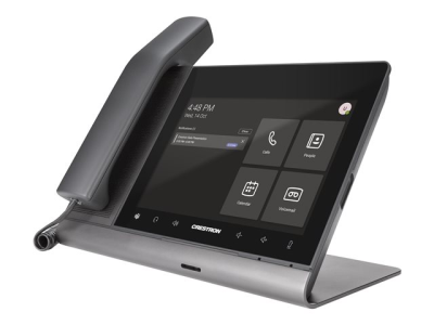 The Crestron Flex UC-P8-T-HS-I desk phone provides a premium voice-over-IP phone solution for use with the Microsoft Teams intelligent communications platform. It offers wideband HD voice quality and full-duplex hands-free speakerphone capability in an elegant desktop design. It features a large 8 in. color touchscreen display, hearing aid compatible handset, and wired or Bluetooth enabled headset support. The phone can be synced with a Microsoft Teams account, with contacts, schedules, voice mails, and other preference settings appearing on the phone's touchscreen.