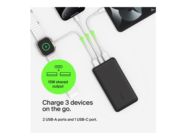 Belkin BoostCharge - Strømbank - 20000 mAh - 15 watt - 3 A - 3 utgangskontakter (USB-C, 2 x USB) - på kabel: USB-C - svart