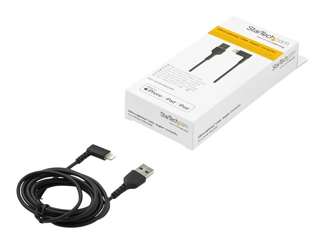 StarTech.com 6ft (2m) Durable USB A to Lightning Cable, Black 90° Right Angled Heavy Duty Rugged Aramid Fiber USB Type A to Lightning Charging/Sync Cord, Apple MFi Certified, iPhone 12 Pro - iPhone 7/8/11/11 Pro - Lightning-kabel - Lightning hann vinklet til USB hann - 2 m - dobbeltisolert - svart