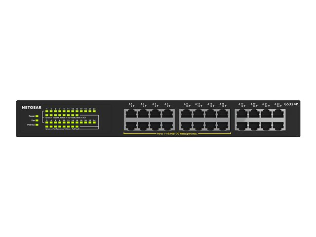 NETGEAR GS324P - Switch - ikke-styrt - 16 x 10/100/1000 (PoE+) + 8 x 10/100/1000 - rackmonterbar, stasjonær - PoE+ (190 W)