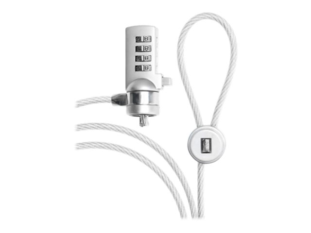 M Security Cable has a 4 wheel combination lock why no key is required. The M Security Cable has a T-lock that fits 95% of all notebooks, projectors and flat screens. The cable is made of quality steel that protects your investment from impulse thefts. It is easy to install and easy to use.