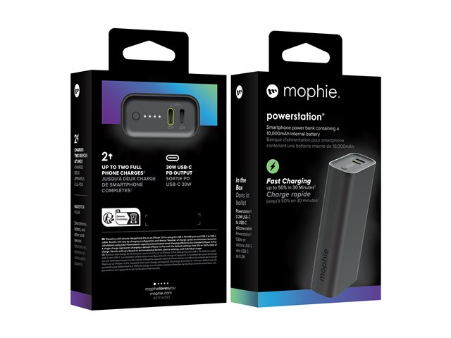 With its Power Delivery fast charge technology, the mophie powerstation can deliver up to 30 W of power. It is equipped with two output connectors, allowing for the simultaneous charging of two devices. An LED indicator provides a quick view of the battery status, making it easy to monitor the remaining power. A single 24 pin USB-C input ensures efficient recharging of the power bank itself.