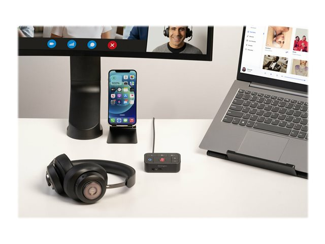 Kensington's Universal 3-in-1 Pro Audio Headset Switch allows professionals to use their favorite wired or wireless headset (Bluetooth, USB-C, USB-A, or 3.5 mm) as they switch between different devices (laptops, phones, and tablets). Accommodates up to three different audio sources, automatically remembers previously paired devices, eliminates the need for multiple headsets, and works with Microsoft Teams, Google Meet, Zoom, WebEx, and more.