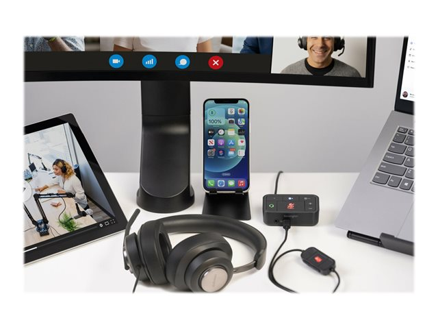 Kensington's Universal 3-in-1 Pro Audio Headset Switch allows professionals to use their favorite wired or wireless headset (Bluetooth, USB-C, USB-A, or 3.5 mm) as they switch between different devices (laptops, phones, and tablets). Accommodates up to three different audio sources, automatically remembers previously paired devices, eliminates the need for multiple headsets, and works with Microsoft Teams, Google Meet, Zoom, WebEx, and more.